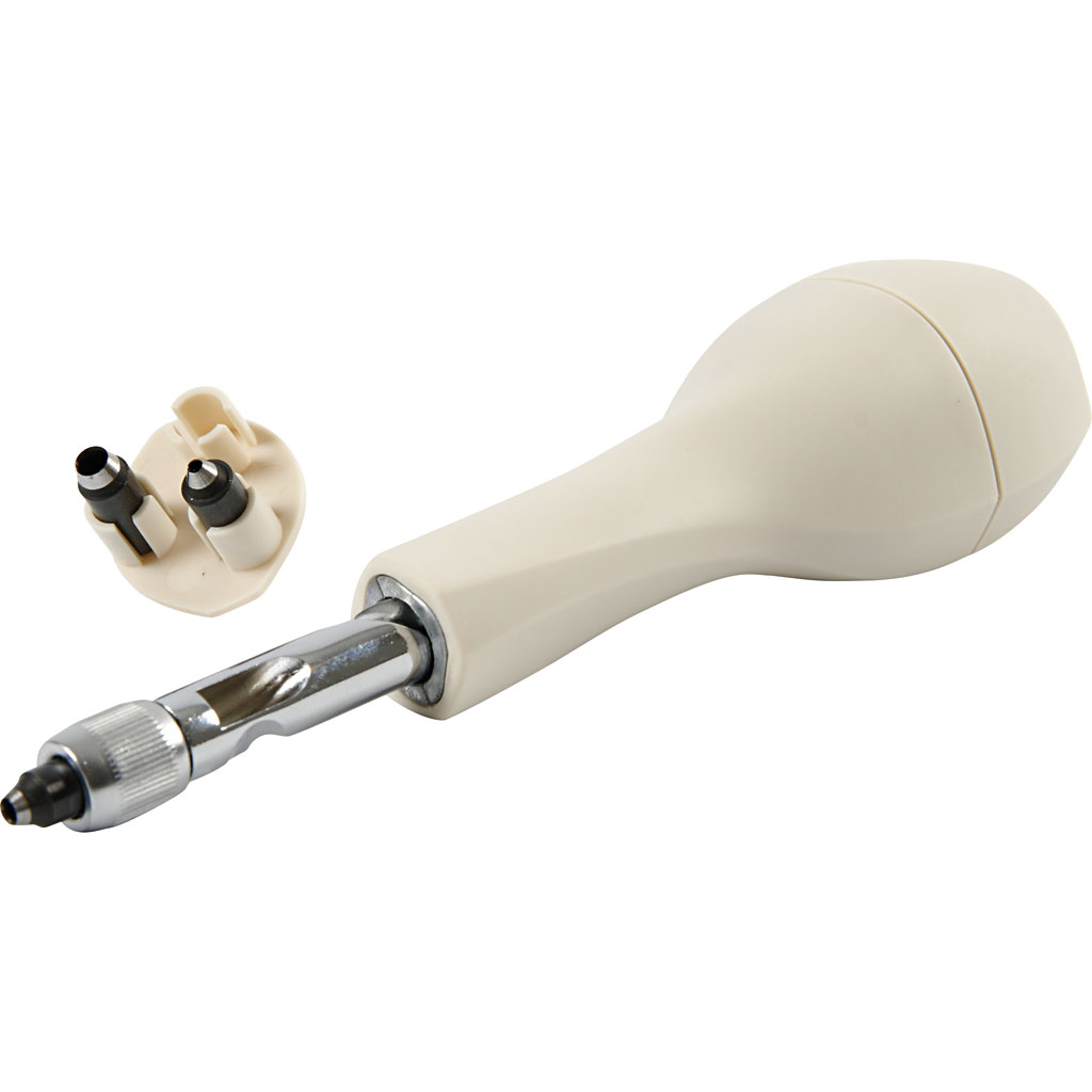 Kolmes suuruses kruvikeerajaga augud mitme kihi paberi, raske kartongi, kanga, spooni, korgi, naha või metallfooliumi läbilõikamiseks. Vahetatavad otsikud on mugavalt käepideme sees
