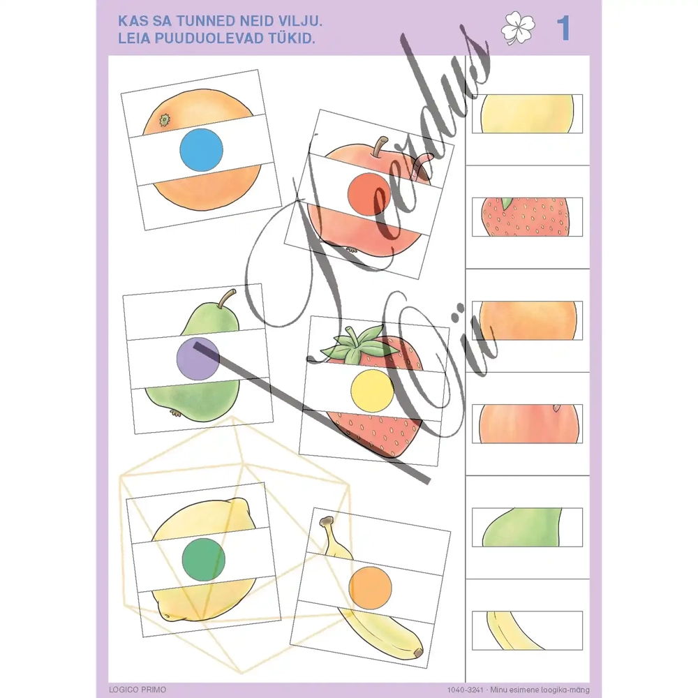 Logico Primo “Minu esimene loogika-mäng” on hariduslik töölehtede komplekt, mis on mõeldud lastele alates 3. eluaastast. See komplekt aitab arendada laste loogilist mõtlemist, tähelepanuvõimet ja probleemide lahendamise oskust.