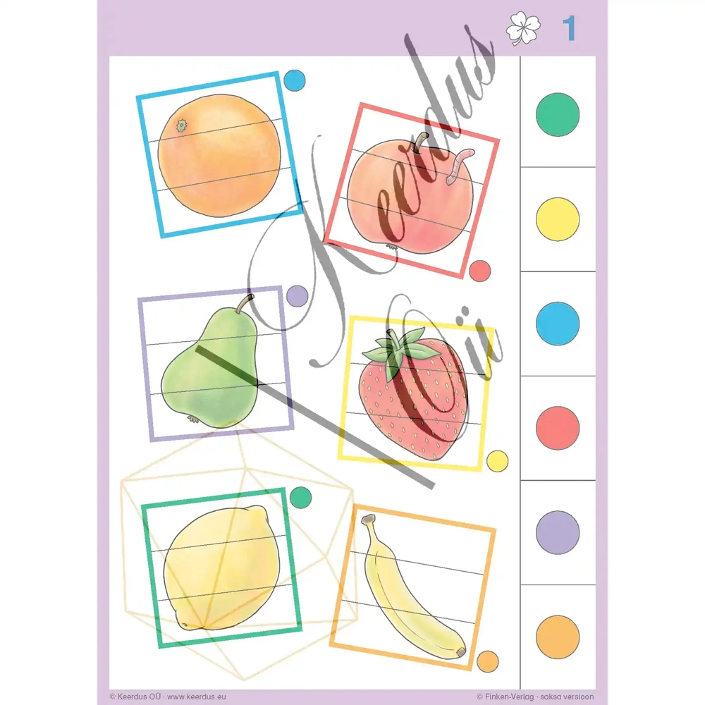 - Õppekaardid: Komplekt sisaldab erinevaid teemapõhiseid kaarte, mis on valmistatud kvaliteetsest ja vastupidavast materjalist. Iga kaart sisaldab mitmeid ülesandeid, mis on seotud konkreetse õppevaldkonnaga, nagu värvid, kujundid, numbrid ja loogika.