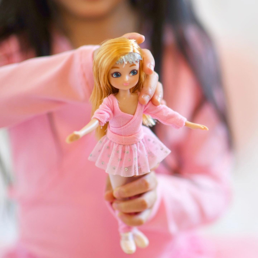 See üliarmas baleriin on riietatud roosasse balletiseelikusse ja ümbritsev kardigan. Tema aksessuaarid – sädelev peapael, jalasoojendajad ja balletikingad – täiendavad autentset balletiklassi välimust.
