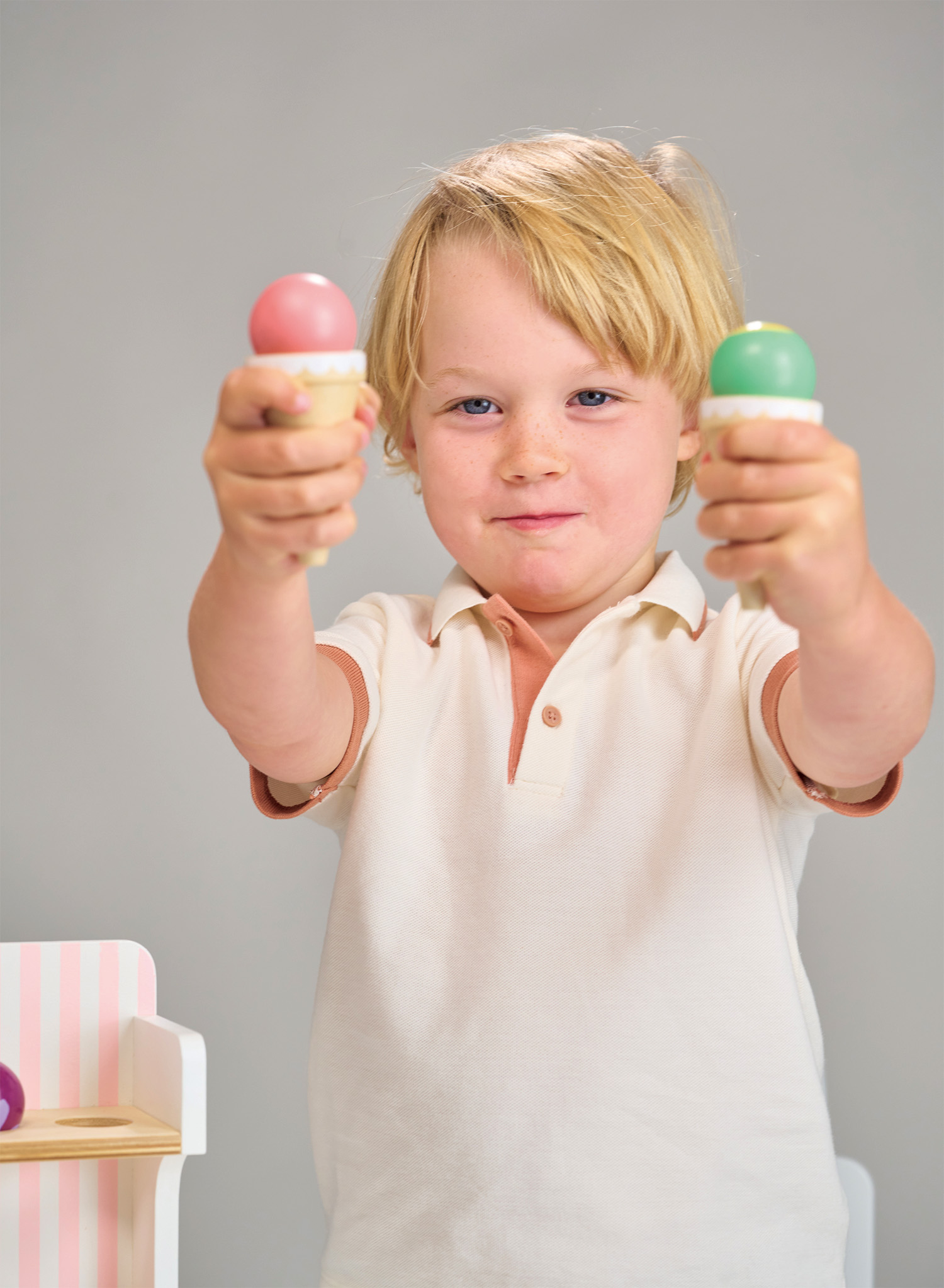 Miniatuurne pood, mille komplektis on kolm puidust jäätisekoonust ja kolm jäätisekulpi, mida saab segada ja sobitada mängu ajal. Loo oma täiuslik jäätisekoonus, vajutades punast nuppu ja lastes jäätisekulpidel maagiliselt koonusel langeda!