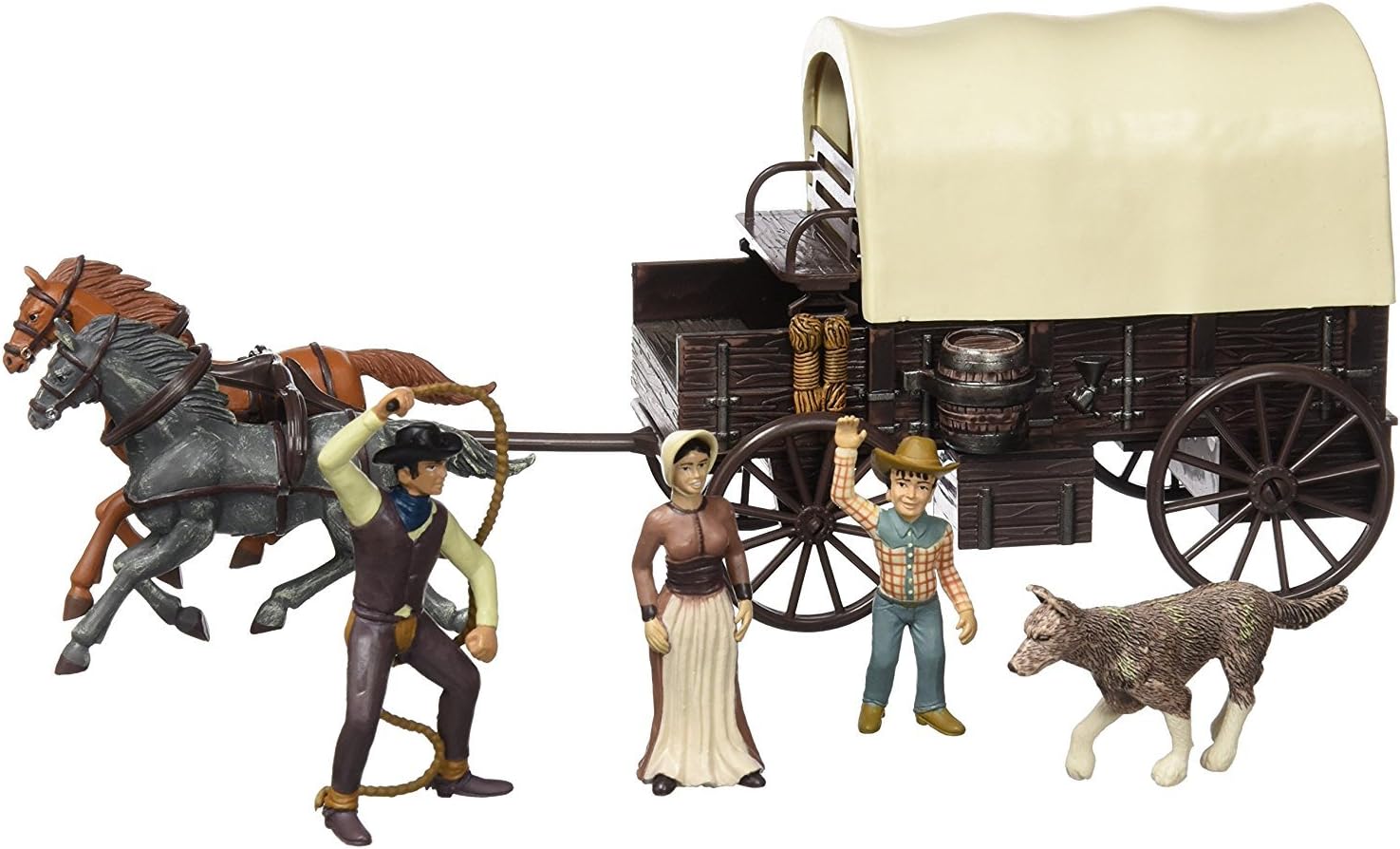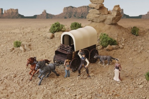 Komplekt sisaldab: “metsiku lääne” vagun, kauboi, naise, lapse ja koera kujukesed.
