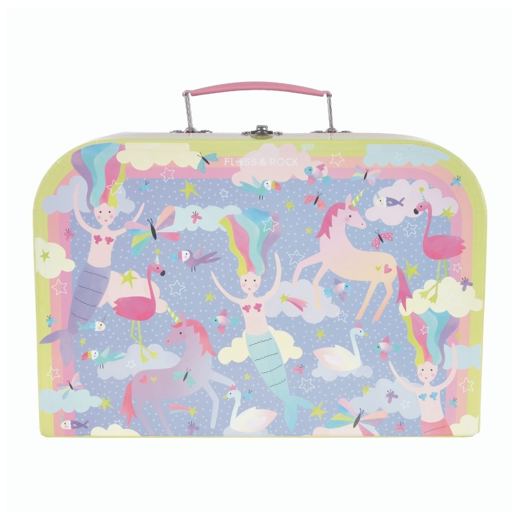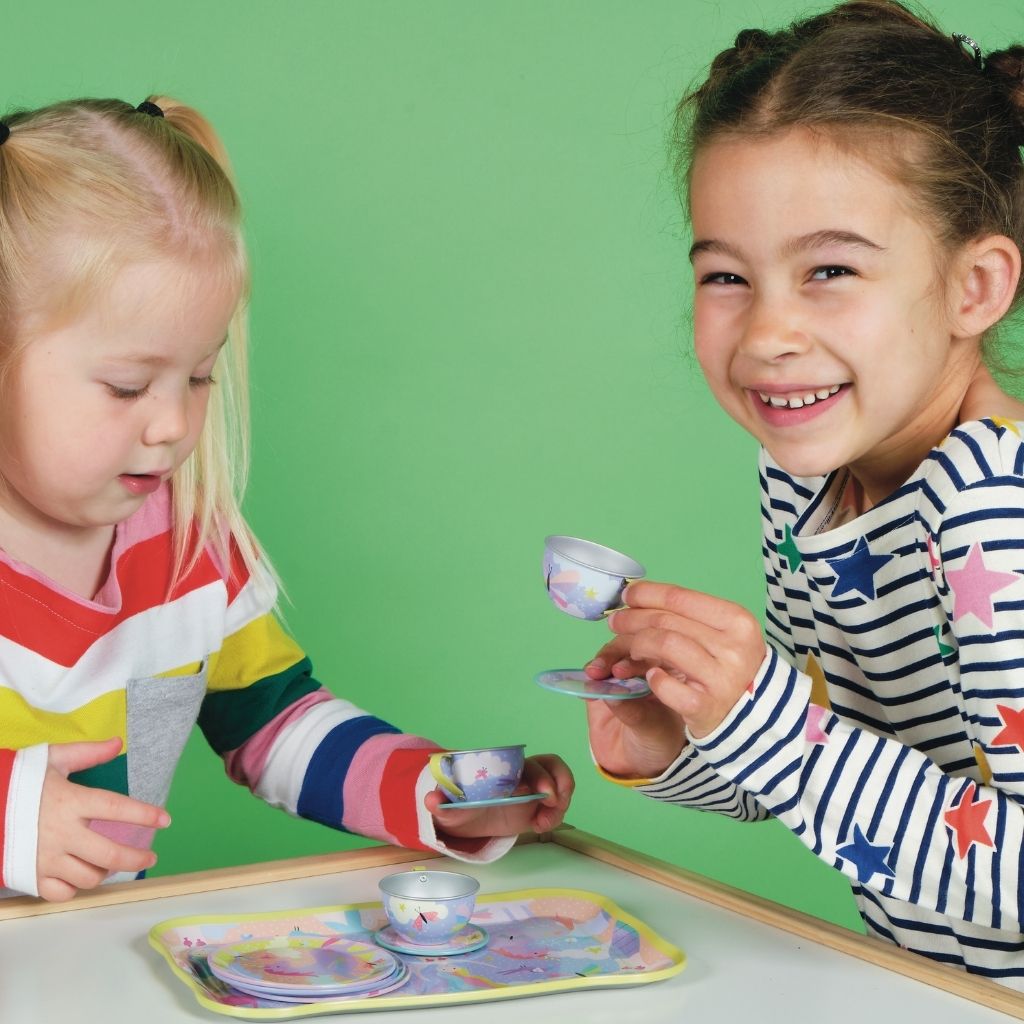 Erksavärvilist karpi ja teekomplekti kaunistavad illustratsioonid ükssarvikutest, merineitsitest, flamingodest, pilvedest, tähedest jm.