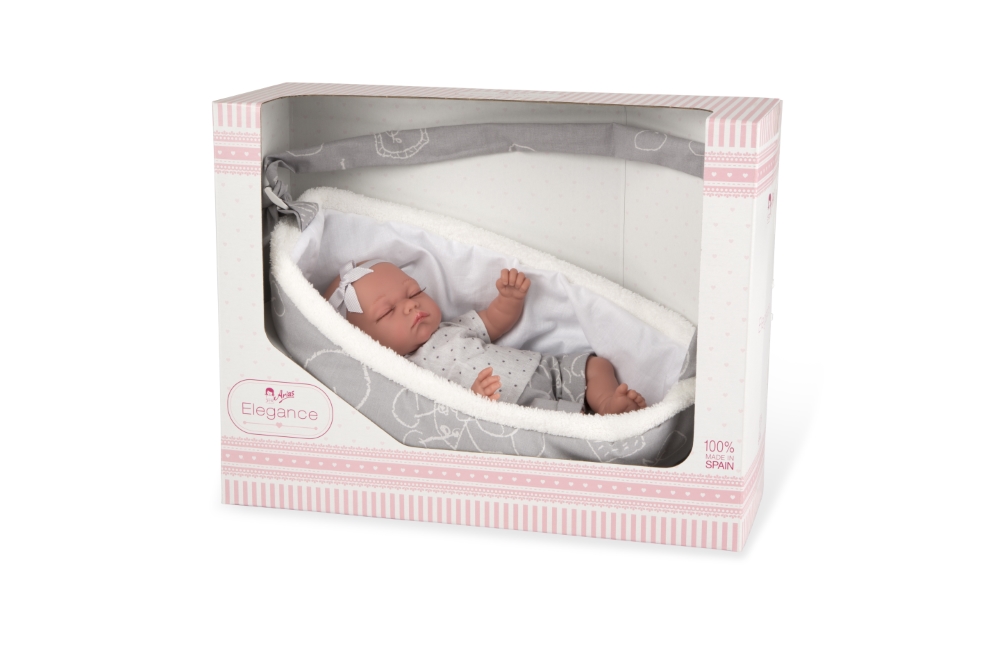 28 CM ELEGANCE nukk halli ja valge kandekorviga kokkusobivate riietega. Sisaldab lutti.