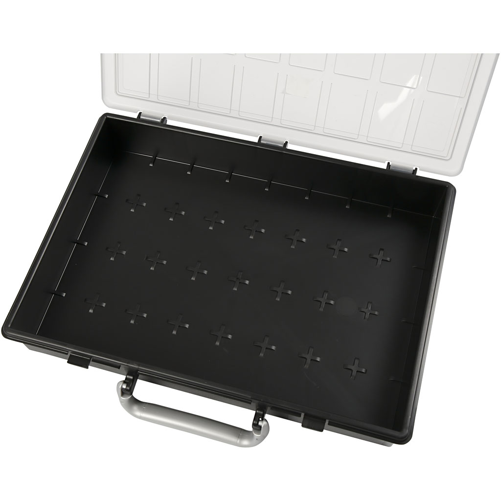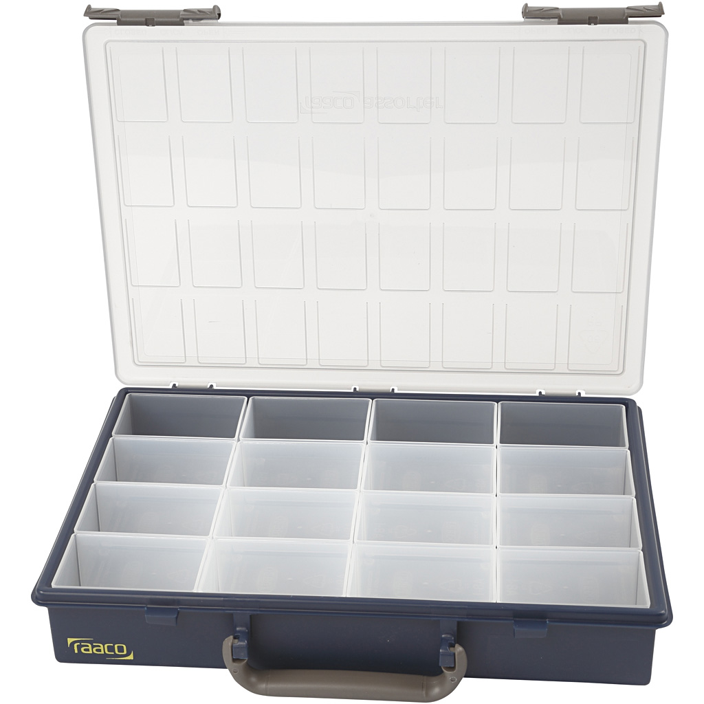 Polüpropüleenist (PP) valmistatud Raaco hoiukast, mis on varustatud lükandluku ja käepidemega. Saab jaotada lisakastide abil.