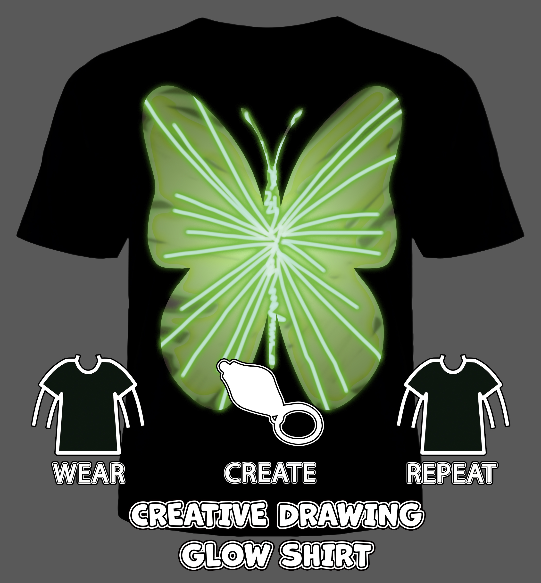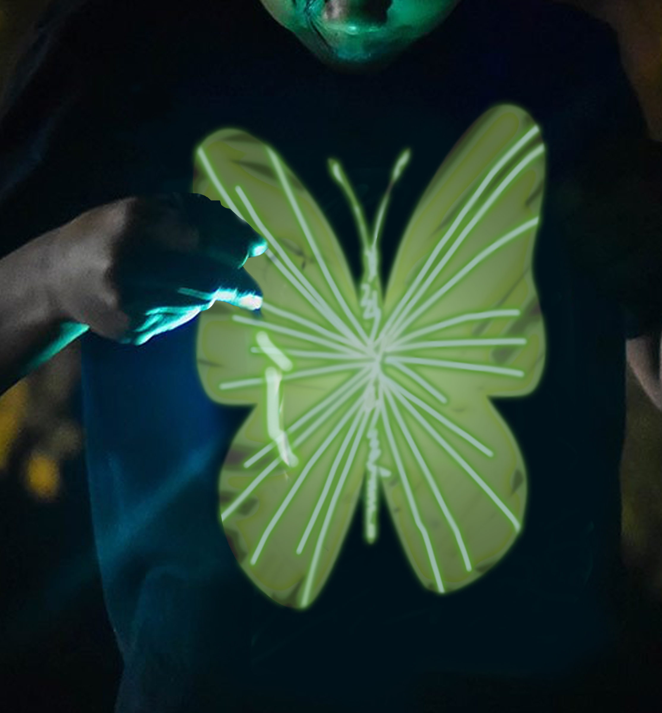 Kasutamine: lülitage UV-pliiats sisse ja joonistage T-särgile valge kujundus. Teie joonistatud kujundus on nähtav hämaras või pimedas. Pilt jääb püsima kuni 5 minutiks ja siis saate kõike otsast alustada. Joonistada saab ka telefoni taskulambi või mõne muu valgusega.