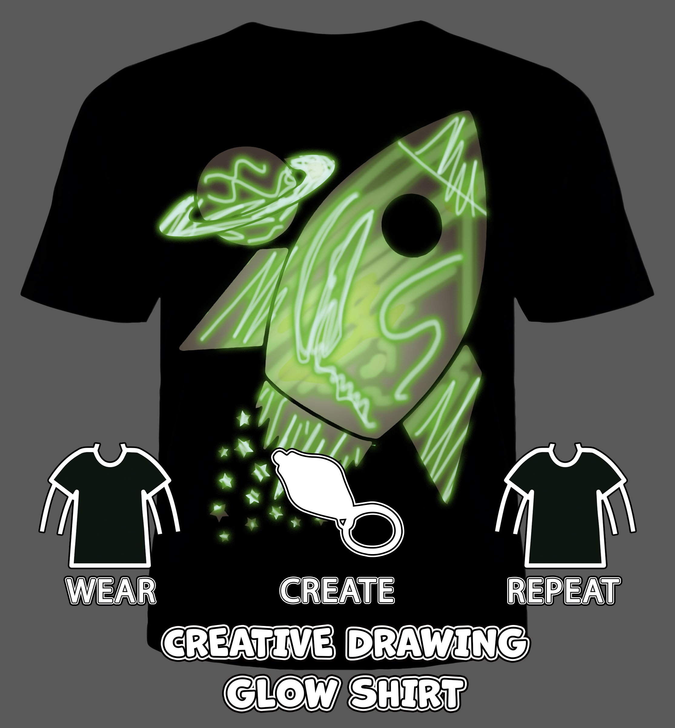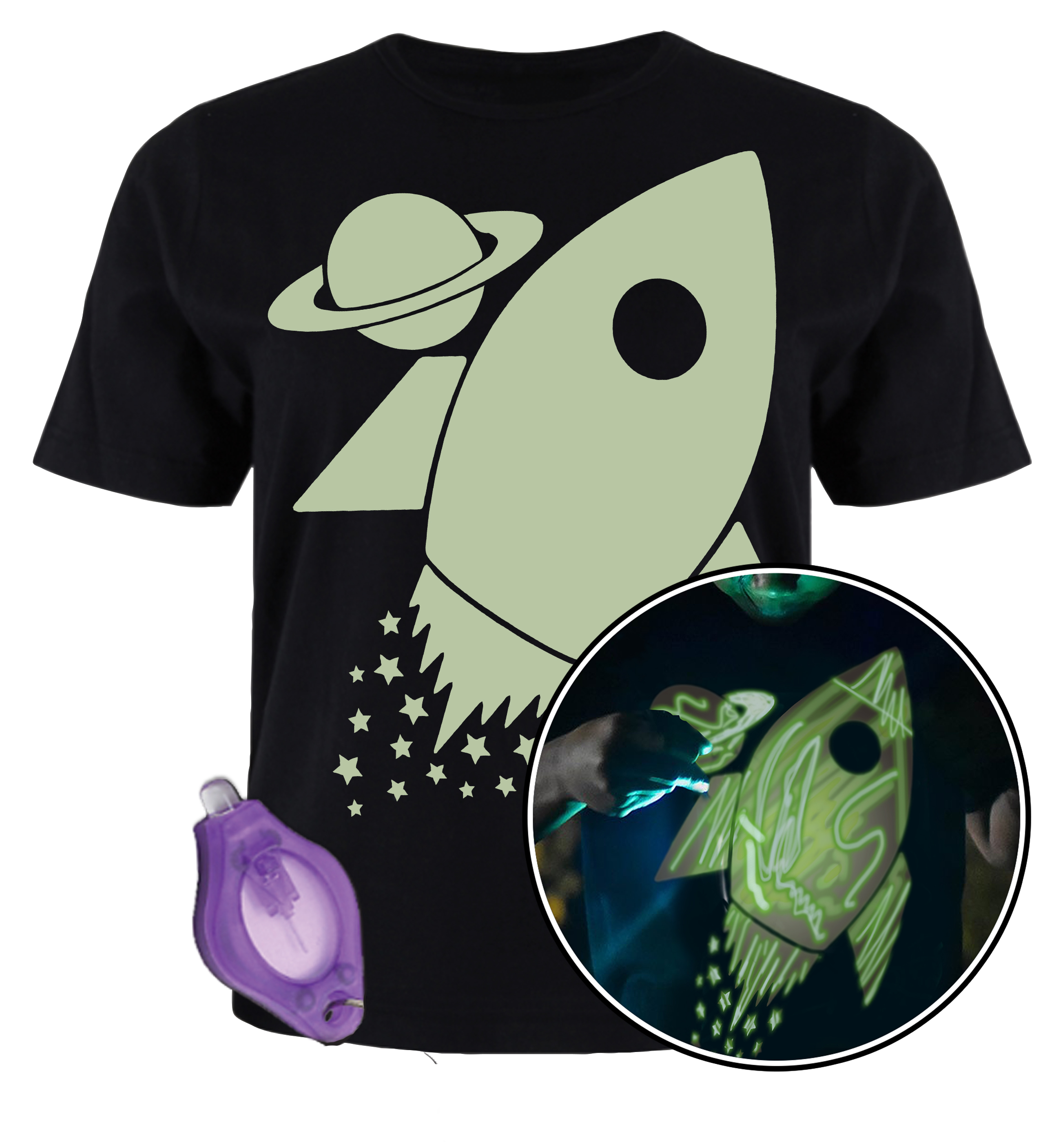 Kasutamine: lülitage UV-pliiats sisse ja joonistage T-särgile valge kujundus. Teie joonistatud kujundus on nähtav hämaras või pimedas. Pilt jääb püsima kuni 5 minutiks ja siis saate kõike otsast alustada. Joonistada saab ka telefoni taskulambi või mõne muu valgusega.