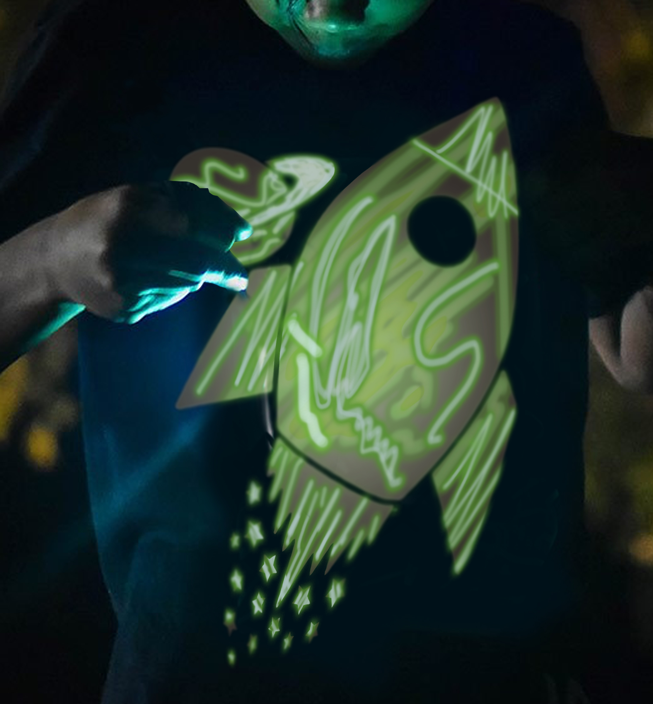 Valge pilt T-särgil helendab pärast valguse käes hoidmist pimedas.