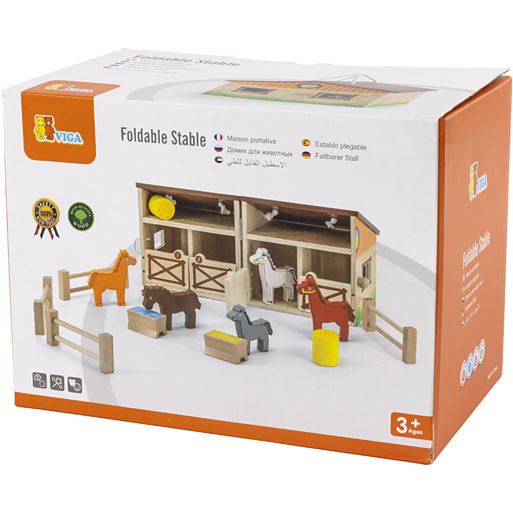 Attraktiivne välja klapitav hobuste, tara, heina ja veekausiga talli, et saaksite hobuste eest hoolitsemist mängida. Valmistatud kvaliteetsest puidust koos käepidemega.