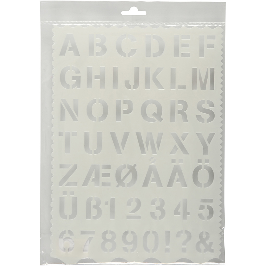Valgest plastist šabloon – tähtedega (A-Å), numbritega (0-9) ja sümbolitega.
