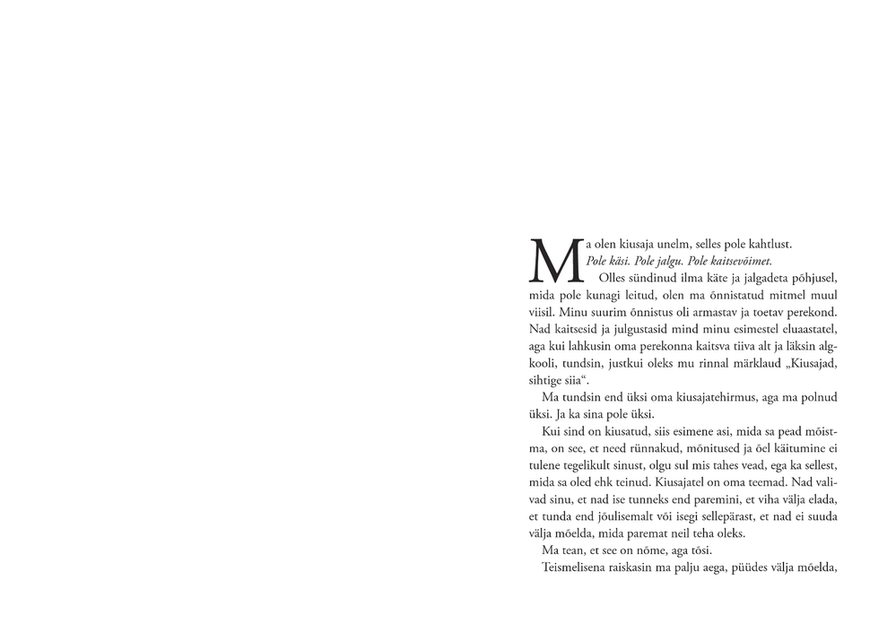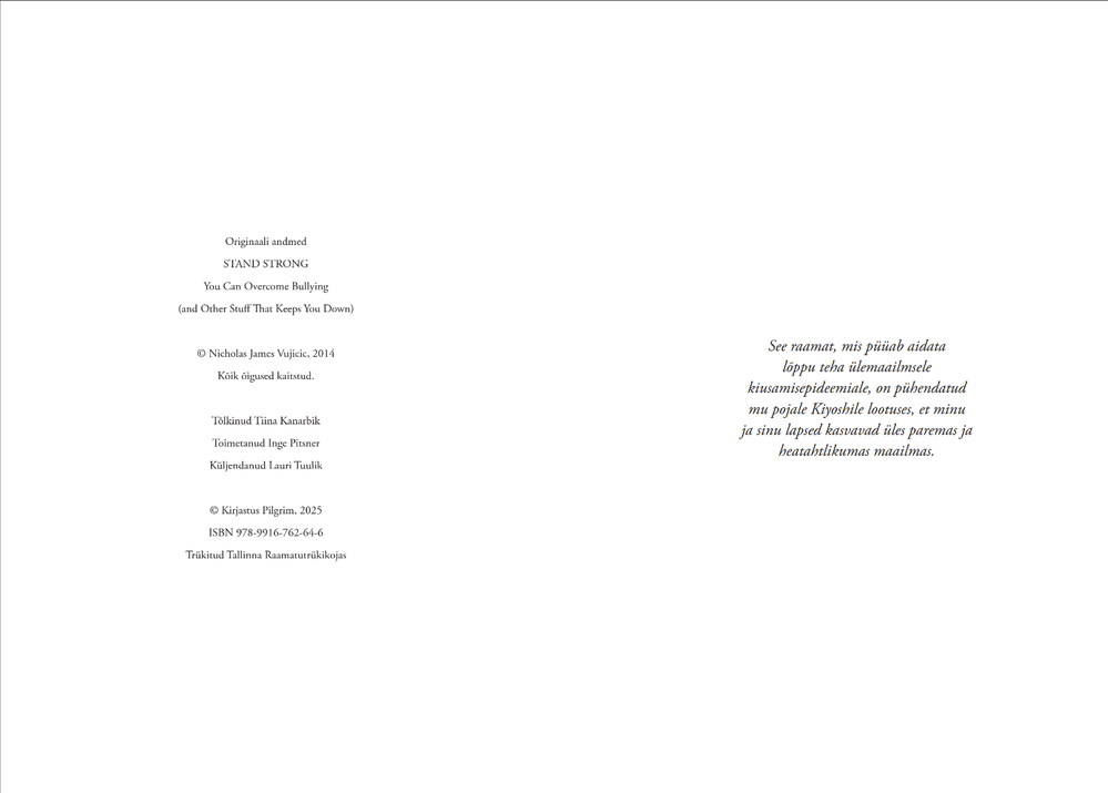 - Teiste aitamine: Lisaks eneseabile rõhutab Vujicic ka teiste toetamise olulisust, julgustades lugejat märkama ja aitama neid, kes võivad samuti kogeda tõrjutust või kiusamist.