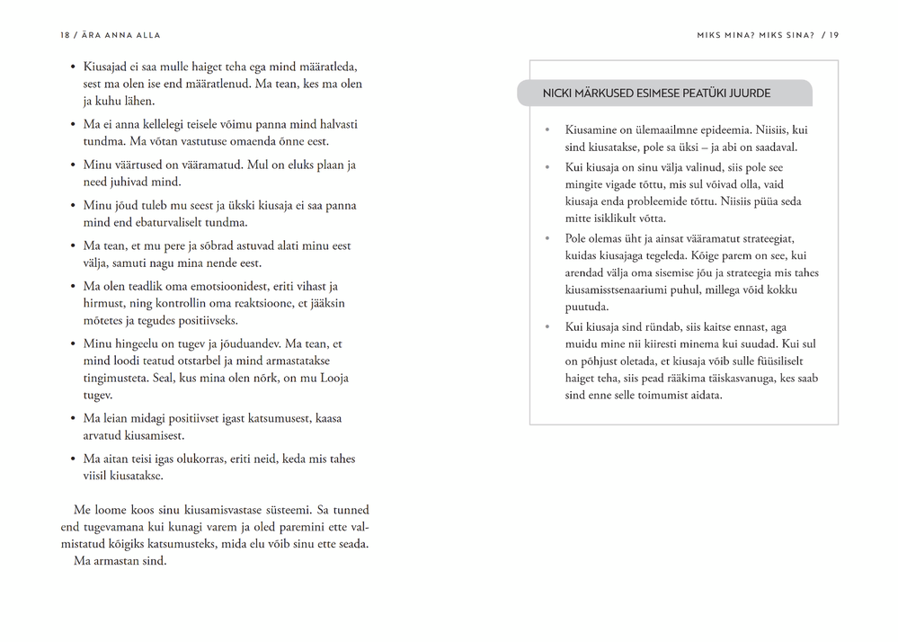 - Praktilised nõuanded: Raamat ei piirdu ainult teoreetiliste mõtisklustega, vaid pakub konkreetseid strateegiaid, kuidas luua endas turvatsoon, kehtestada isiklikke piire ja arendada välja tugev enesehinnang.