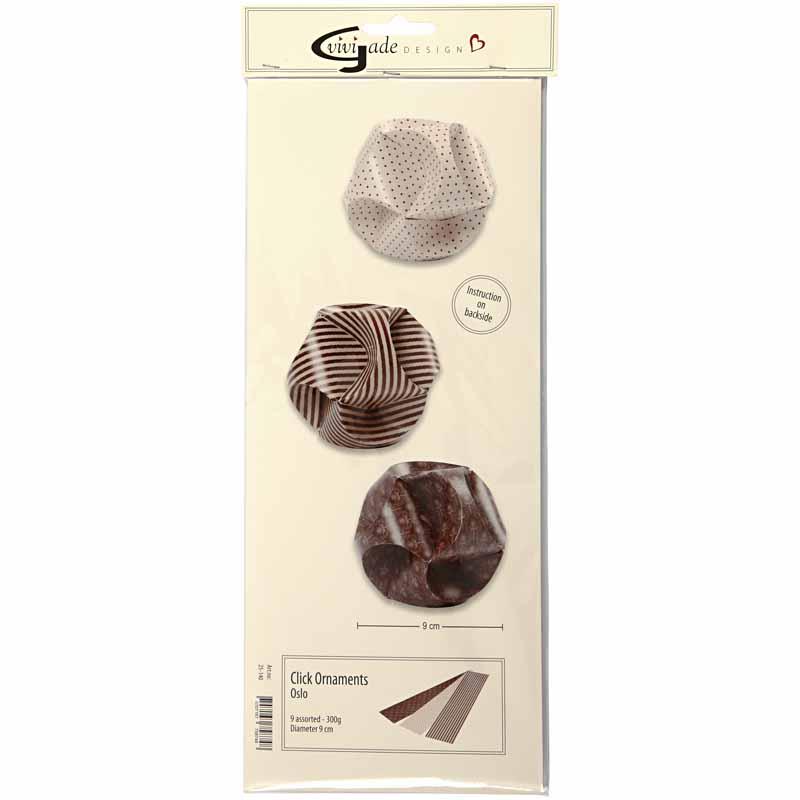 Vivi Gade disainist välja lõigatud kaardiribad 9 ornamendi jaoks. Diameeter näitab ornamendi suurust. Pakendis on 3 kujundust, millest igaühes on 9 tk ribasid 9 tk jaoks. Click Ornaments – juhised lisatud