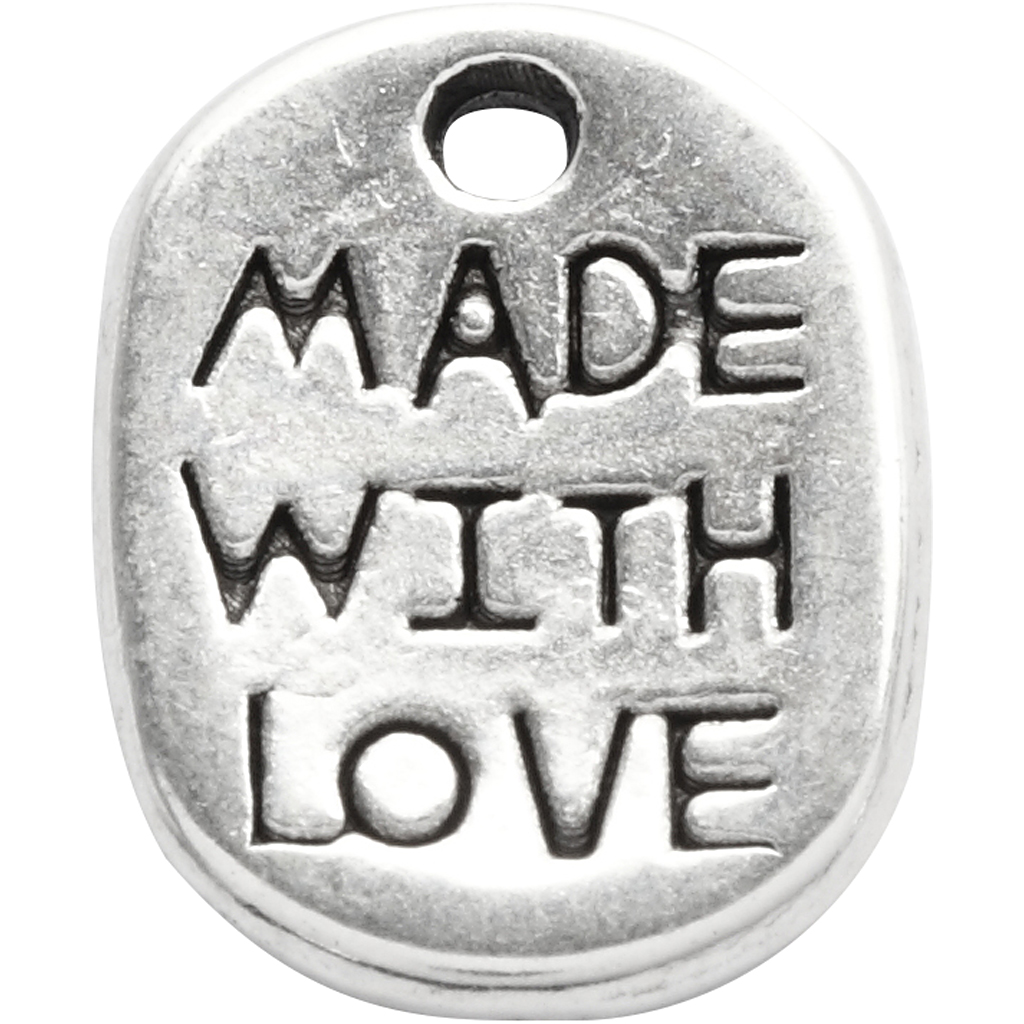 Metallist ripats, mis on kujundatud ümara metallplaadi kujul, millel on augud ja reljeefne tekst, millel on kirjas “Made with love”.