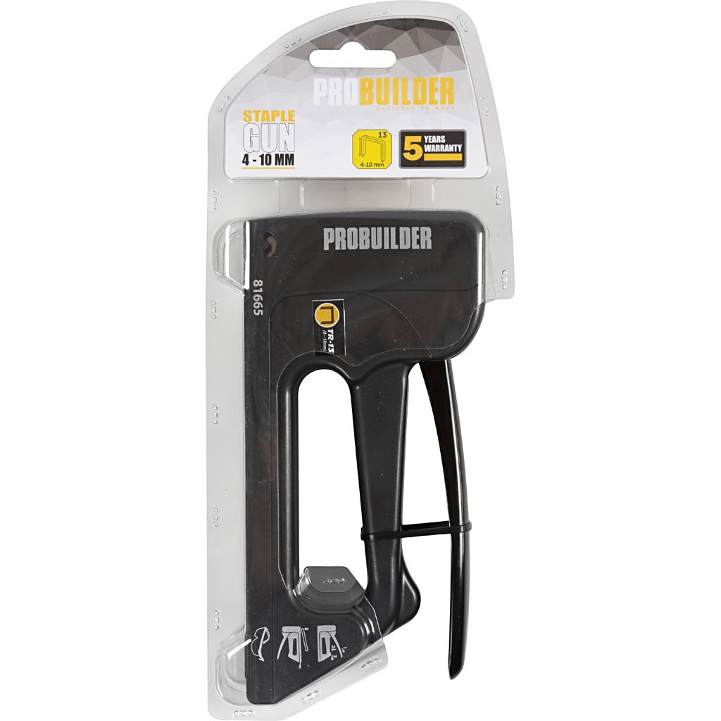 Mustast lakitud terasest, karedast, probuilderi klammerdaja ergonoomilise käepidemega. Kasutatakse peenraste klambrite kinnitamiseks polsterdamiseks jne.