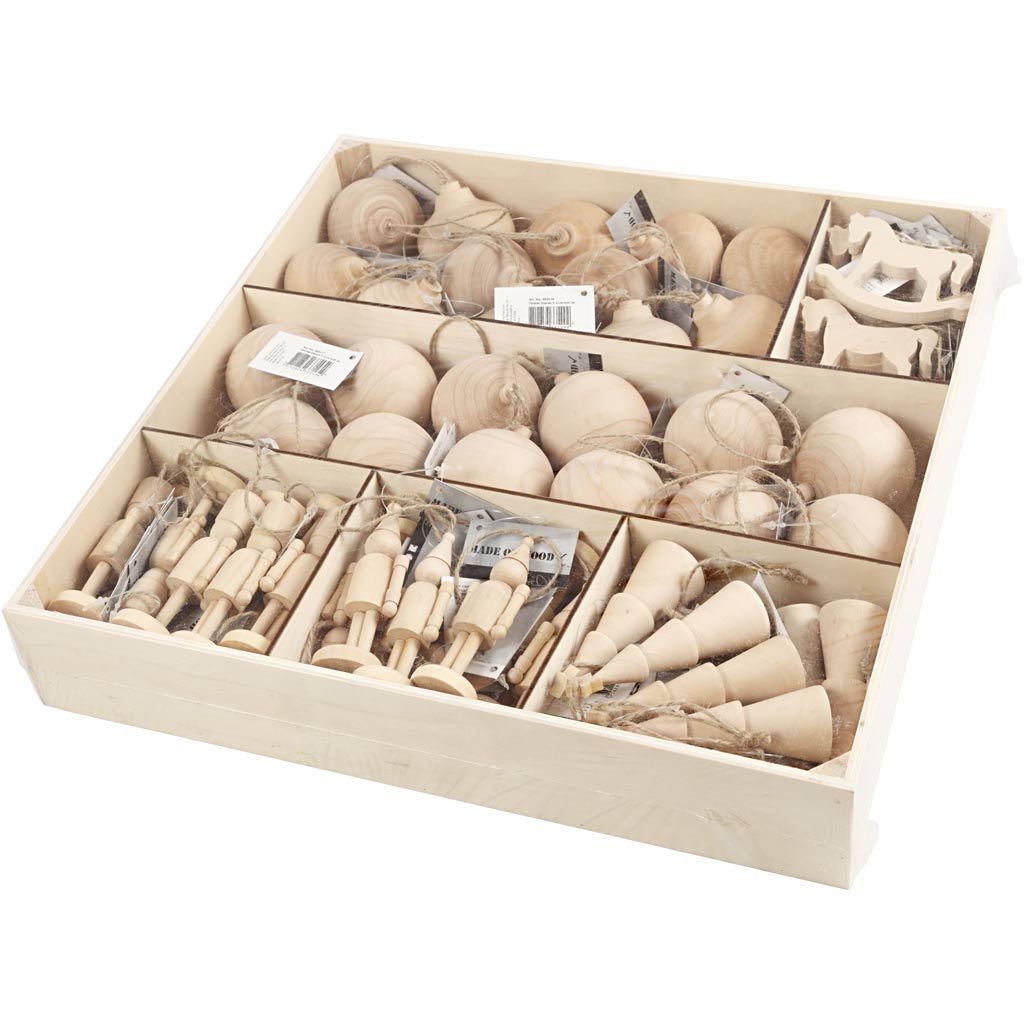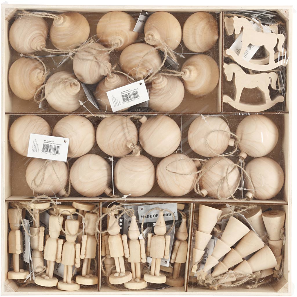 Puidust jõulukaunistused koos rippuva nööriga. Motiivid: jõulupall, tilk, 2 erinevat figuuri, jõulupuu ja kiikhobune