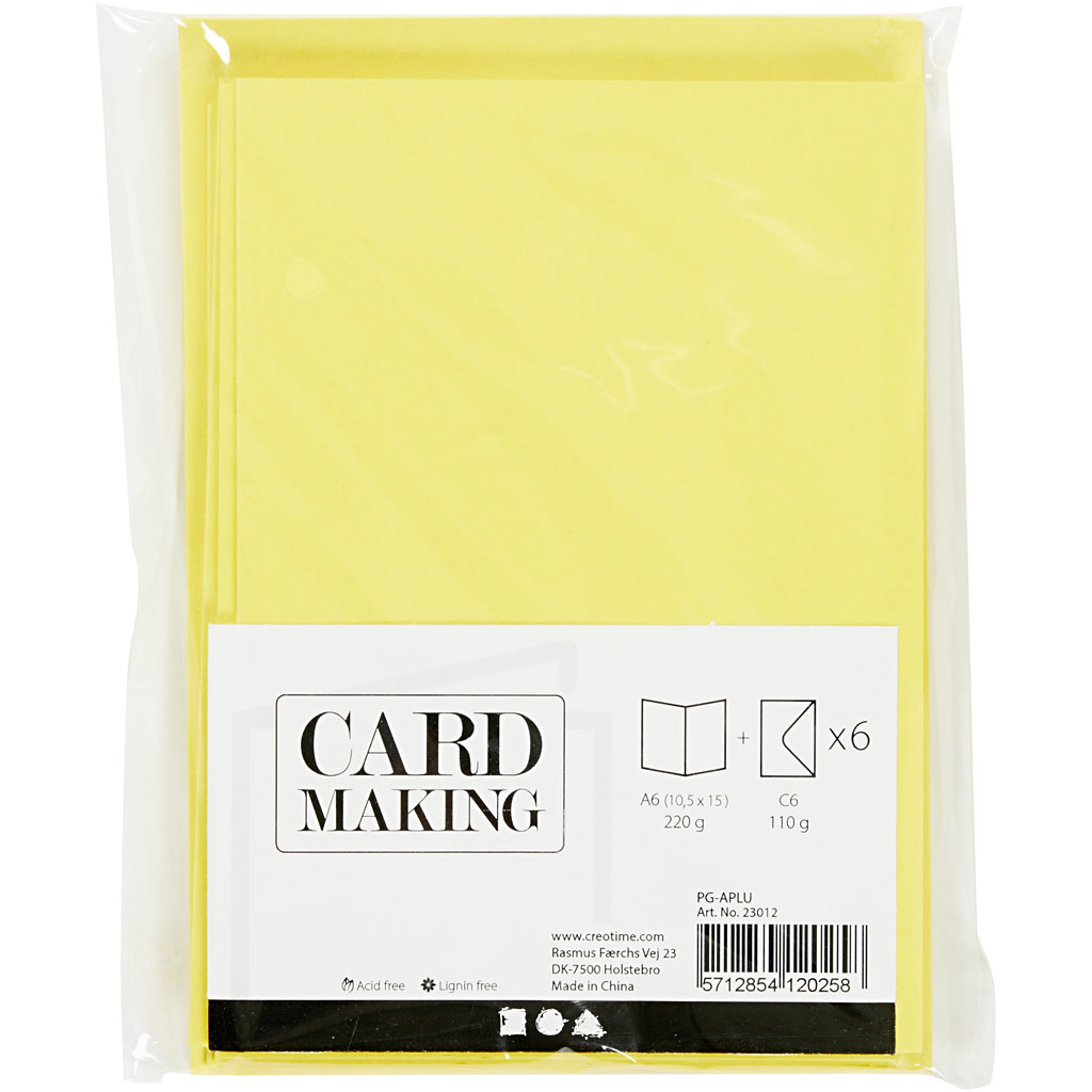Kaardid ja ümbrikud, kaardi suurus 10,5×15 cm, ümbriku suurus 11,5×16,5 cm, 110+220 g, kollane, 6 komplekti/ 1 pakend.