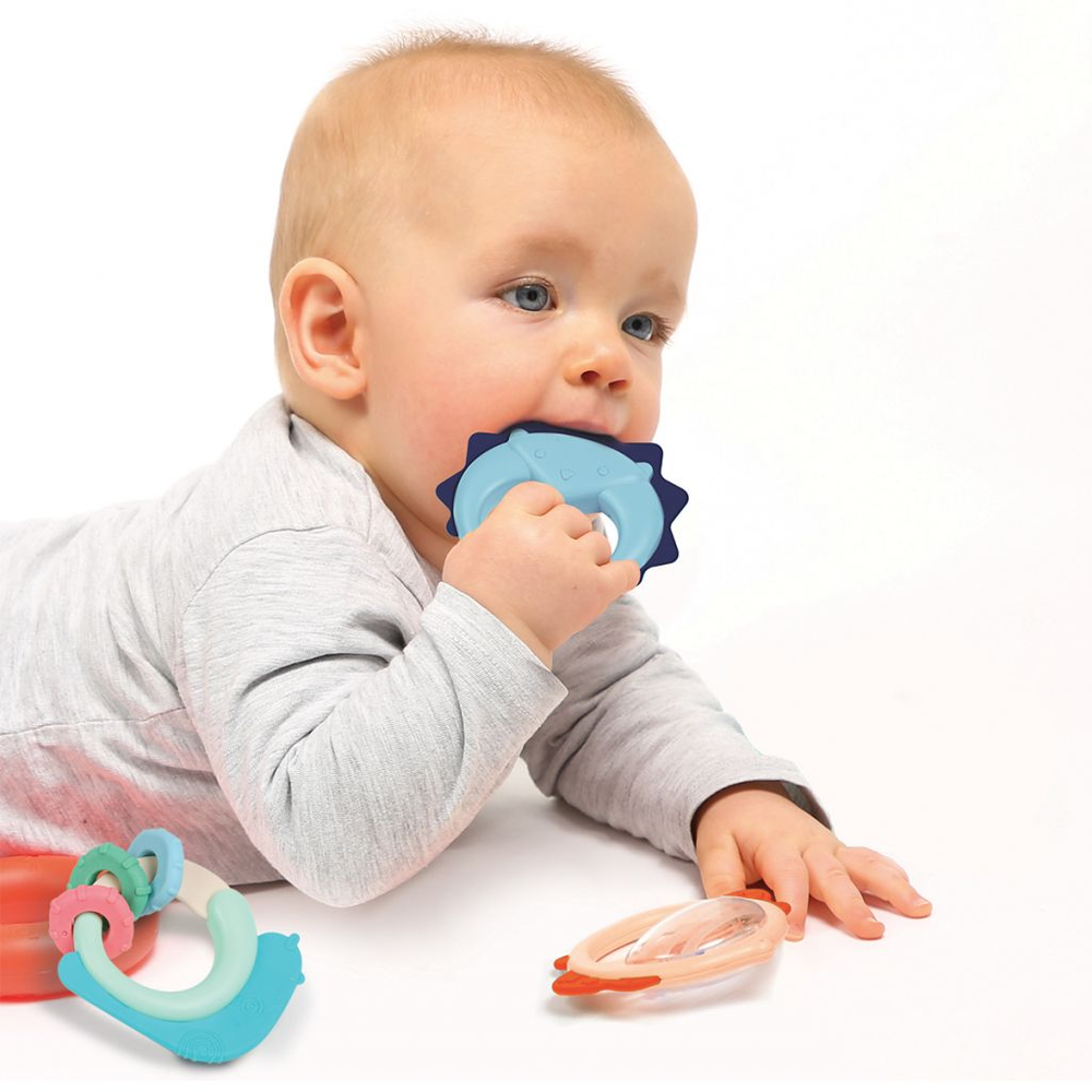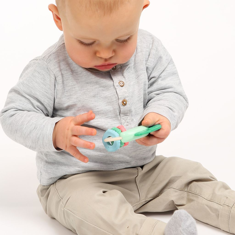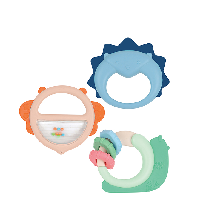 Each rattle has a special part made of soft, flexible plastic, designed to be chewed. They soothe baby’s little teeth, so they’ll love putting them in their mouth. They are very sturdy, so they stand up to rough handling and are very easy to clean.