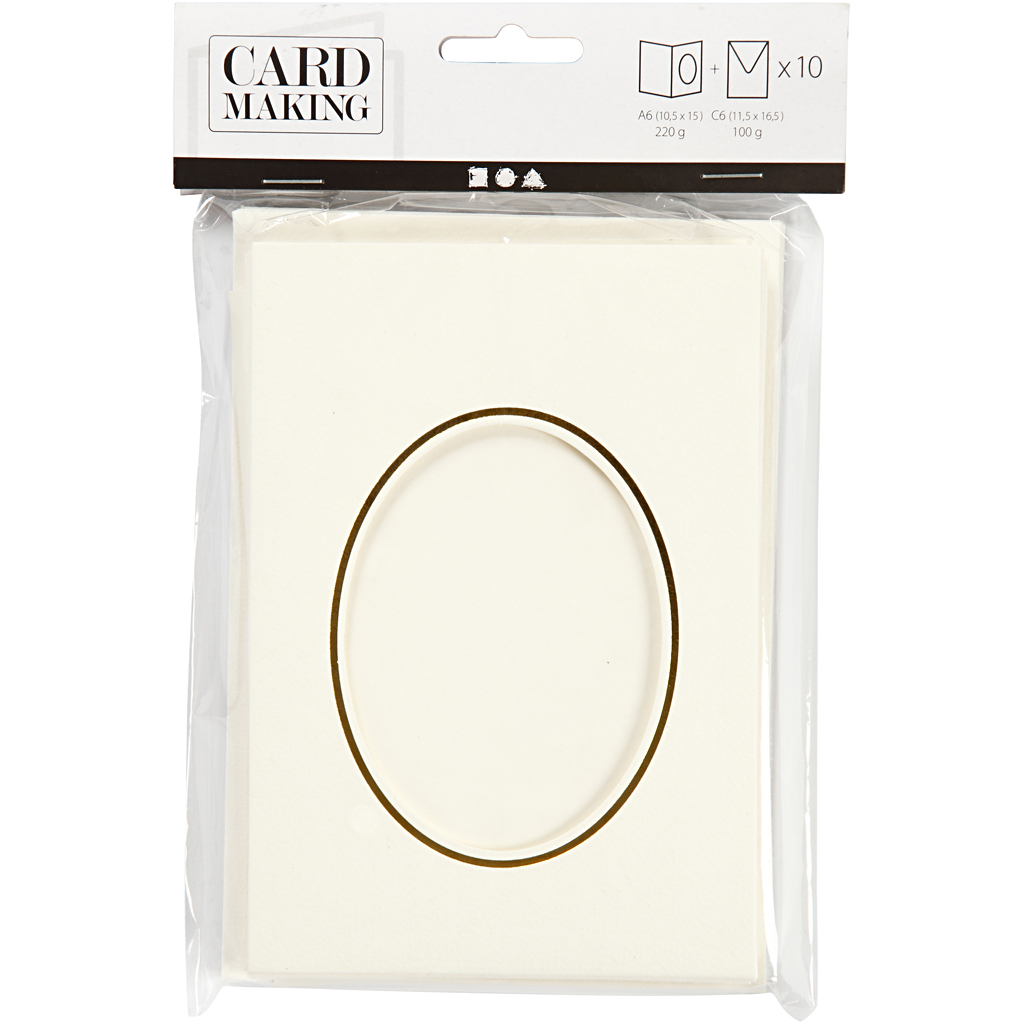 Passepartout kaart, ovaalne, kuldse äärisega, kaardi suurus 10,5×15 cm, ümbriku suurus 11,5×16,5 cm, naturaalvalge, 10 komplekti/ 1 pakk