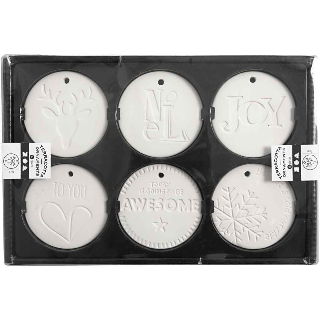 Valgusest terrakotast valmistatud ornamendid, millel on auk riputusnööri jaoks