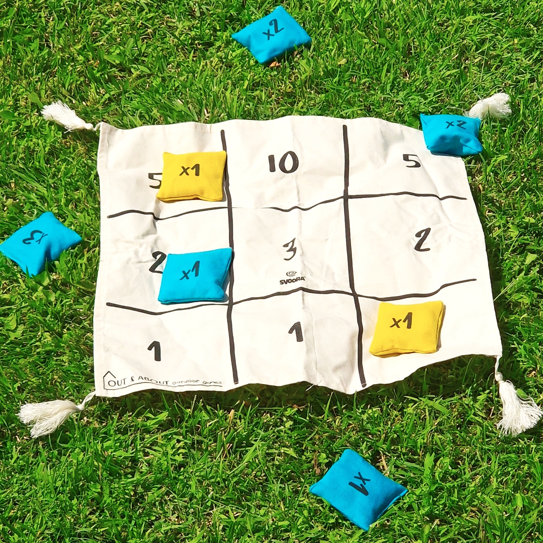 - Iga mängija võtab 5 sama värvi kotti. Visake kotikesi, püüdes need saada riidest mängulauale, ja arvutage oma punktid.