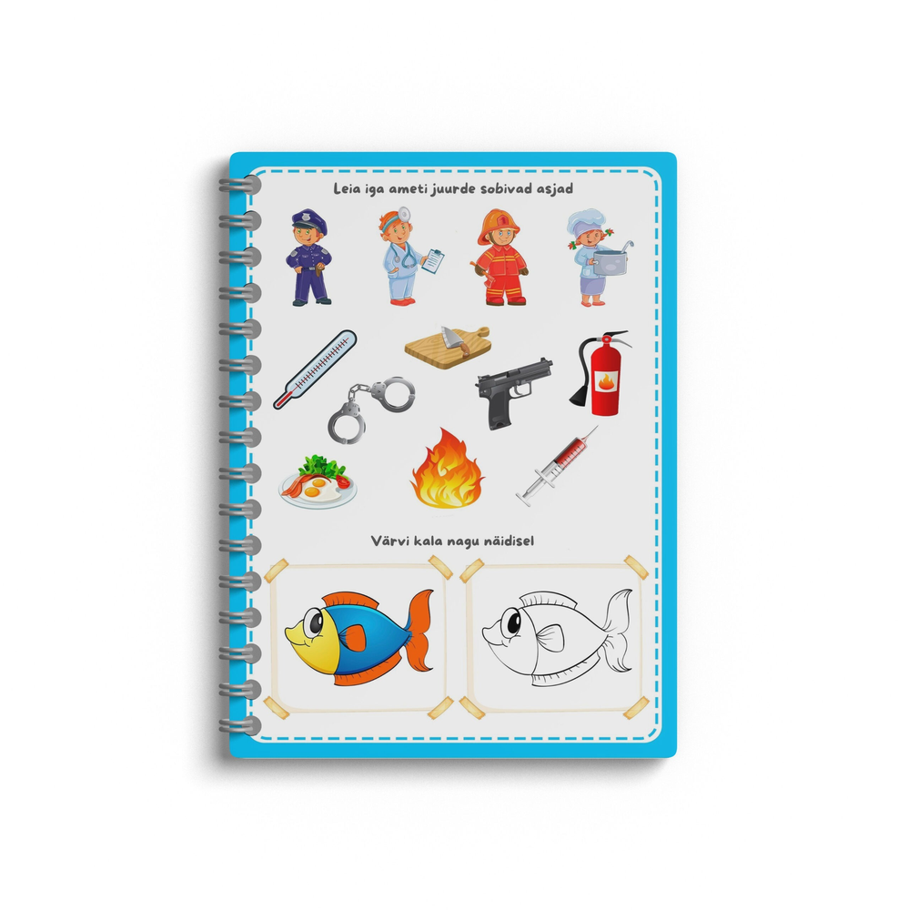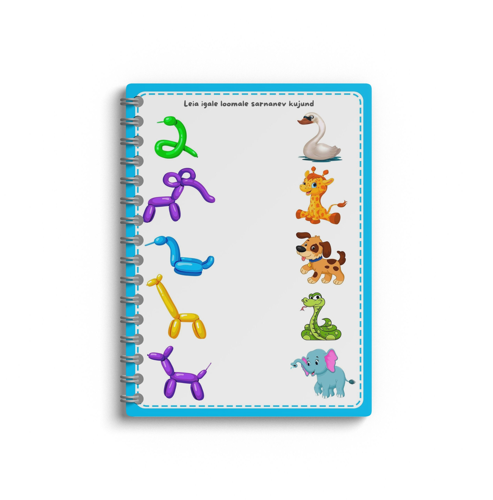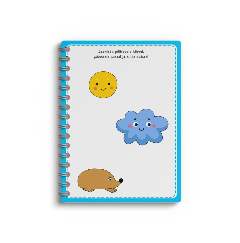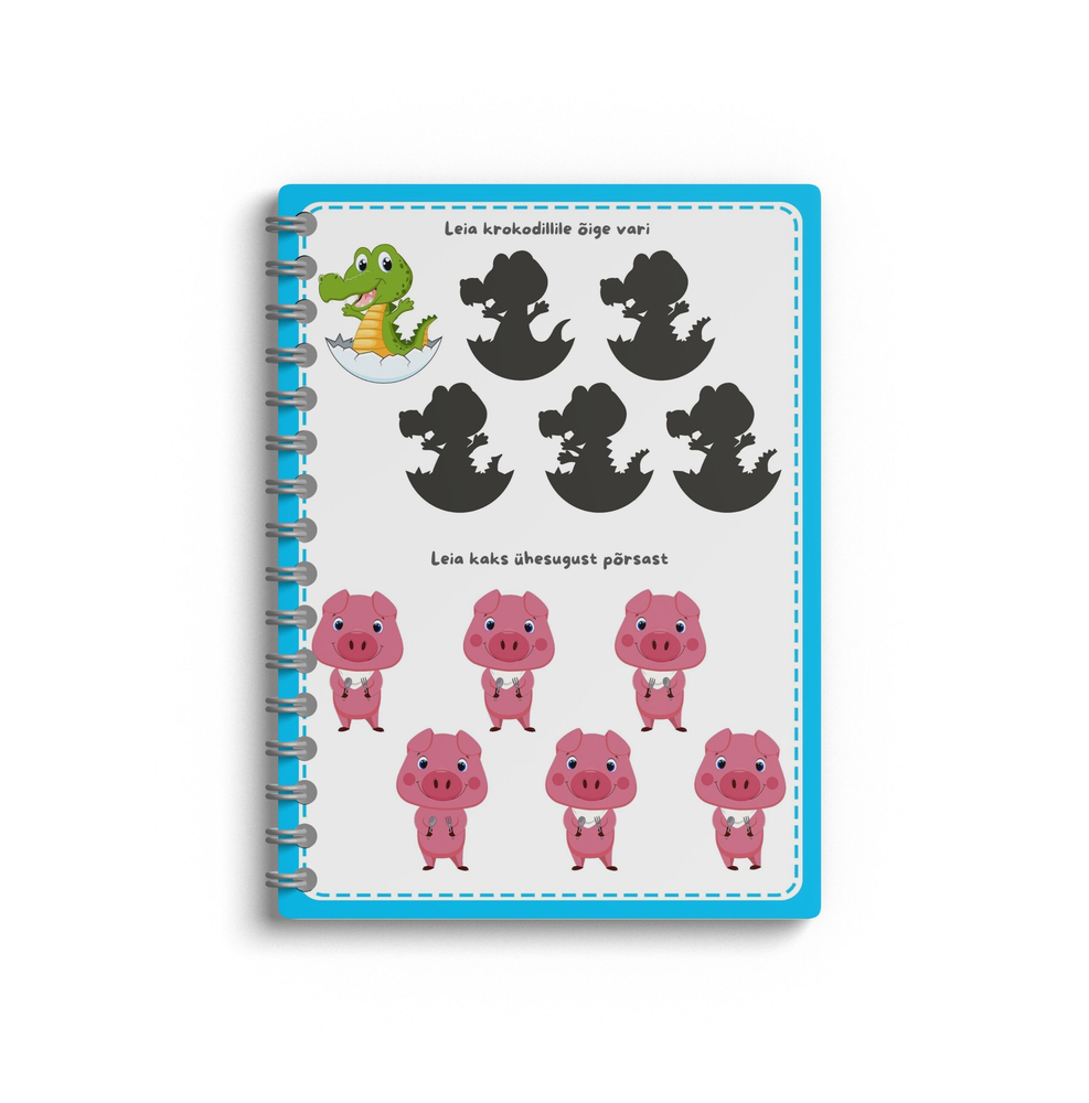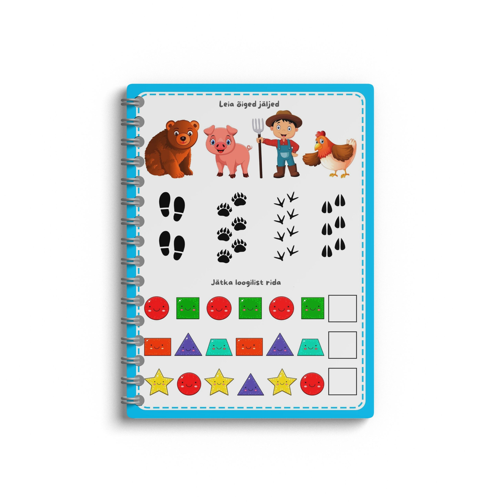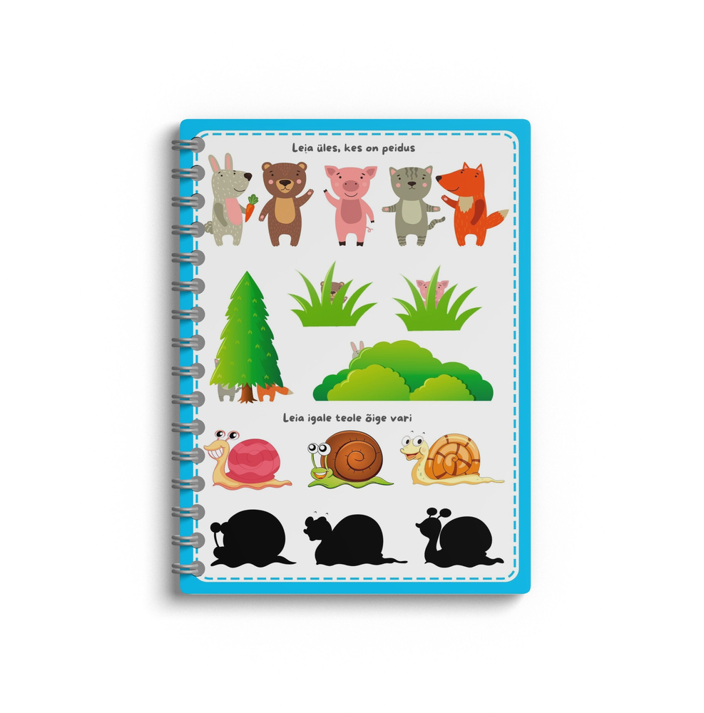 Vihik sisaldab 20 erinevat töölehte, mis on mõeldud 3+ vanuses lastele, kuid sobib ka alates 2. eluaastast koos vanema juhendamisega. Lehed on lamineeritud ja võimaldavad kirjutamist tahvlimarkeriga – kõik vastused saab hiljem hõlpsasti kustutada niiske lapi või salvrätiga. Spiraalköide teeb lehtede pööramise mugavaks ning tagab vastupidavuse ka aktiivses kasutuses.