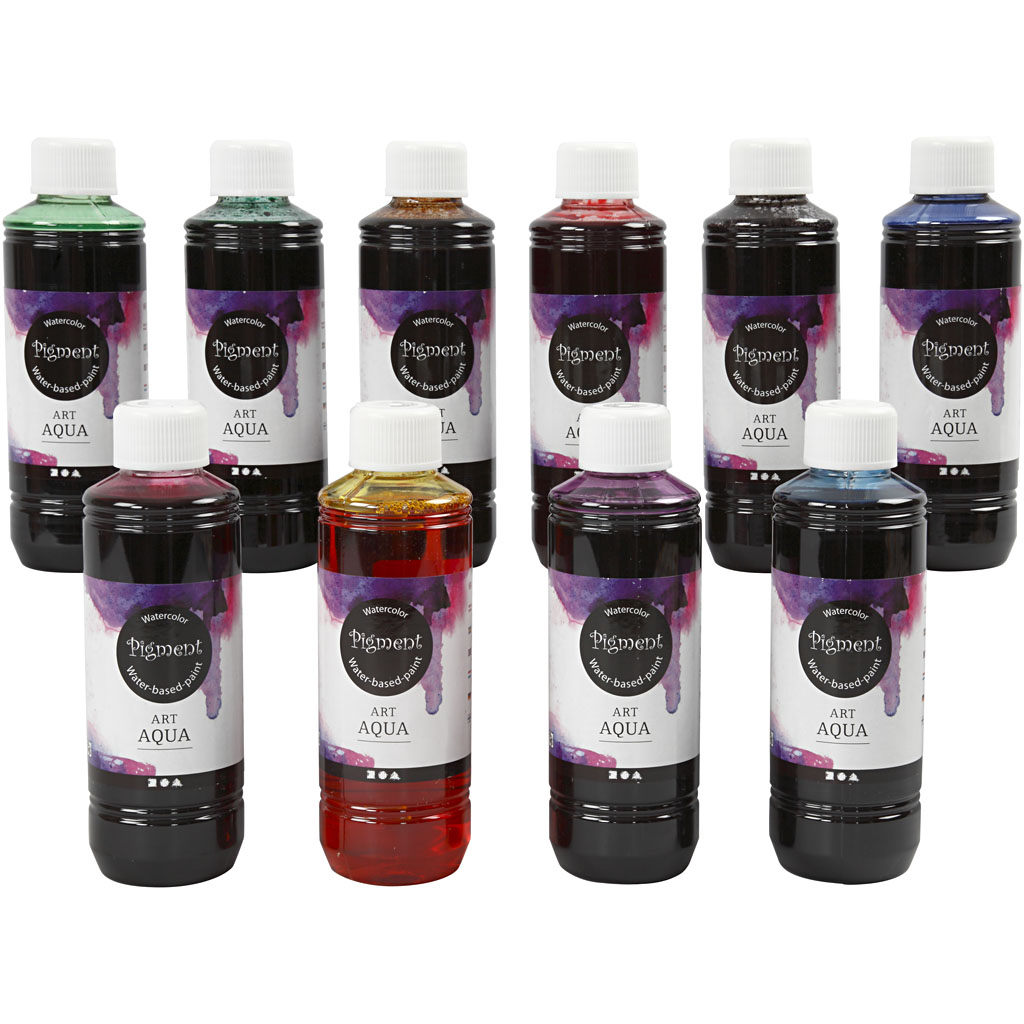 Valik kvaliteetseid Art Aqua Pigmen akvarellivärve – värvid on segatavad lõpmatu mitmekesisuse saavutamiseks ja neid saab veega lahjendada.
